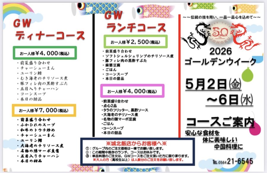 5月2日~6日まではゴールデンウイークコースのみとさせていただきます。